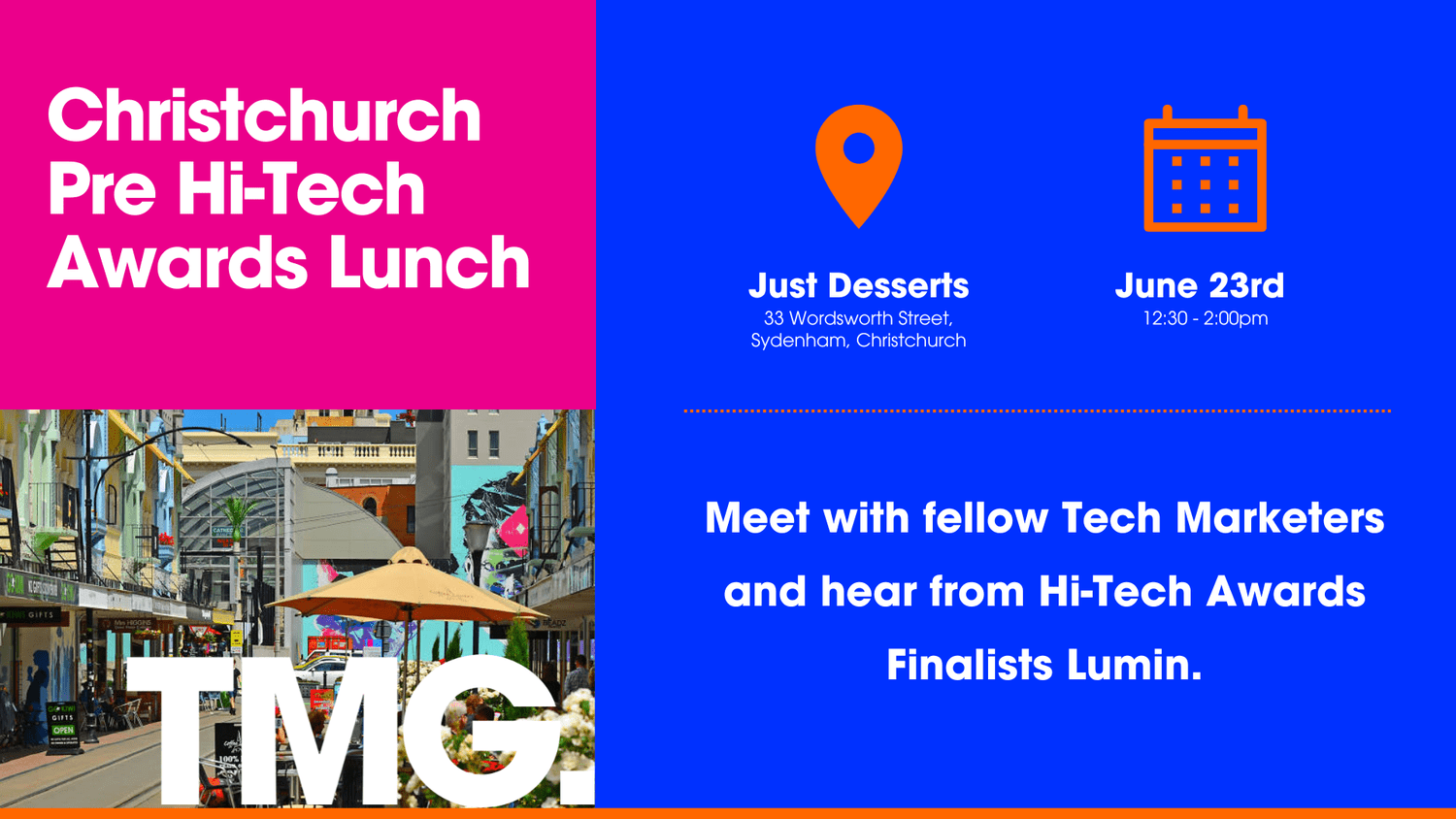 Christchurch is thrilled to be hosting the Hi-Tech Awards this year on June 23rd! Let’s come together for lunch beforehand with our Christchurch Tech Marketers, and anyone visiting from out of town for the awards, to share our stories and celebrate the incredible tech companies we have in New Zealand.